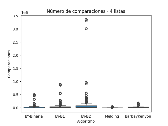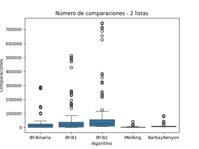 BY-B1, con búsqueda no acotada, introduce una fase de exploración previa que genera mayor número de comparaciones. Esta sobrecarga se hace más evidente en los conjuntos de 3 y 4 listas (Figuras 5 y 6), donde su dispersión y valores máximos son notoriamente superiores a los de BY-Binaria.